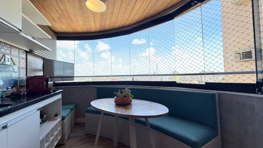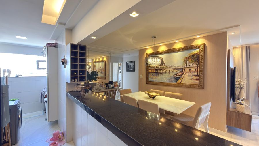 A cozinha americana integrada à sala cria um ambiente amplo e convidativo, ideal para receber amigos e familiares. A varanda proporciona momentos relaxantes com uma vista agradável, enquanto a área de serviço oferece praticidade para o seu dia a dia.